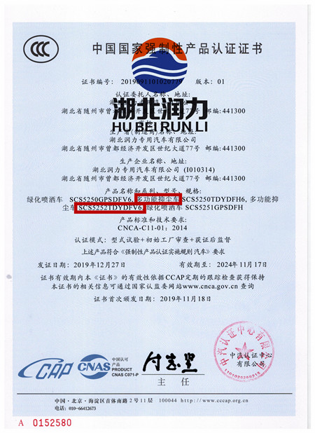 湖北润力专用汽车有限公司多功能抑尘车**证书